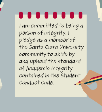 The commitment to integrity is an expression of Santa Clara University’s Catholic, Jesuit identity. The Santa Clara University community is dedicated to the promotion of values consistent with academic and personal excellence. Academic integrity is one of those values and the Academic Integrity Pledge is an important way that students demonstrate their commitment to this value. Committing to academic integrity not only emphasizes the value of a Santa Clara education, it also expresses the values that are a cornerstones of a Santa Clara education: being students of competence, conscience, and compassion who strive to fashion a more humane, just and sustainable world.