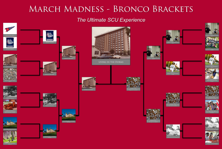 March Madness – Bronco Brackets started with 16 common SCU experiences, matched up in pairs of two, which the SCU community voted between. The competition was single elimination, with the winner of each pairing moving on to the next round.