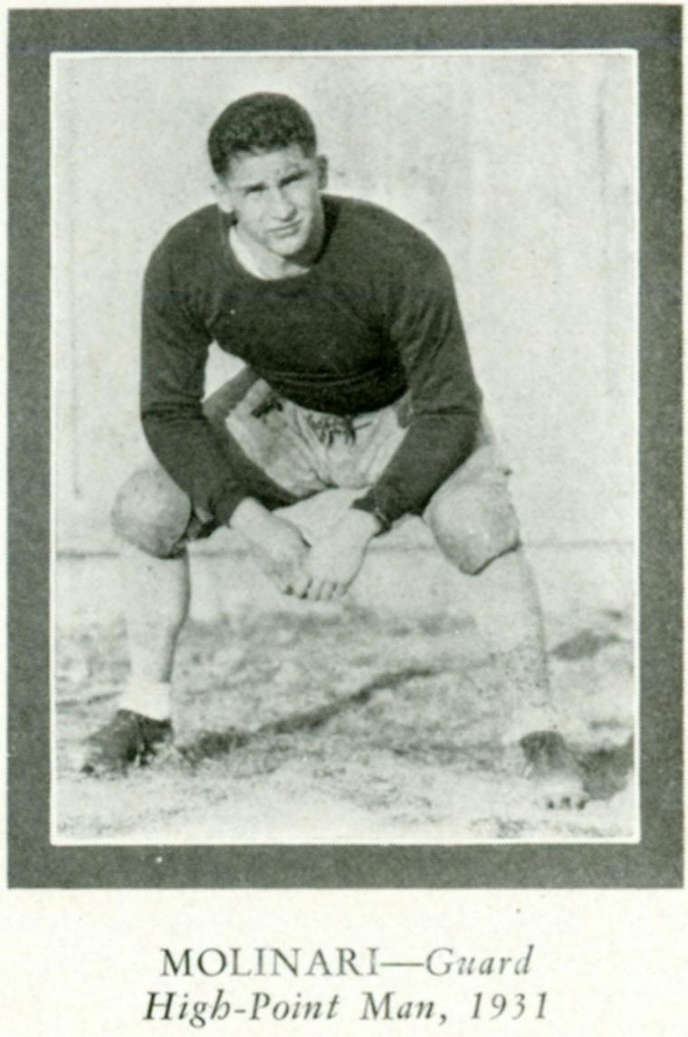 Charles Molinari was a two year starting guard for the Broncos in the early 1930’s. Molinari did not look like a daunting guard to go up against standing 6’0” and weighing 190 pounds, but made up for it with his play. He was the mainstay of the offensive line which eventually earned him All-American honors.