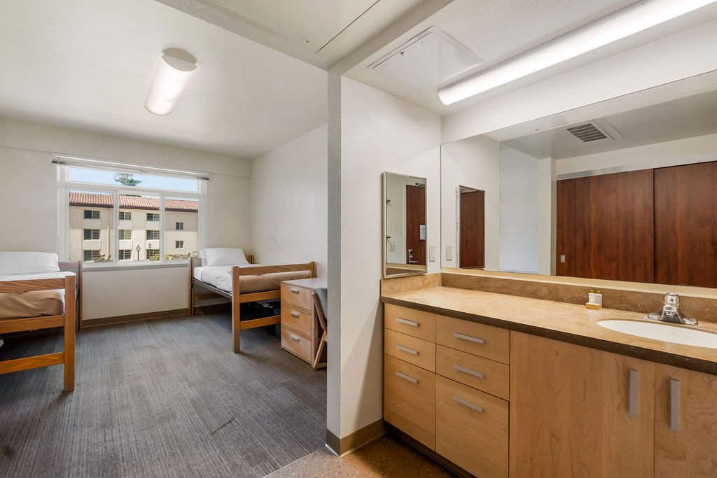 All of our traditional residence halls offer both double and single occupancy bedrooms with communal bathrooms located in each hallway or wing. Additional community spaces included are lounges, laundry facilities and common kitchens. All of our buildings are secured with electronic access control.