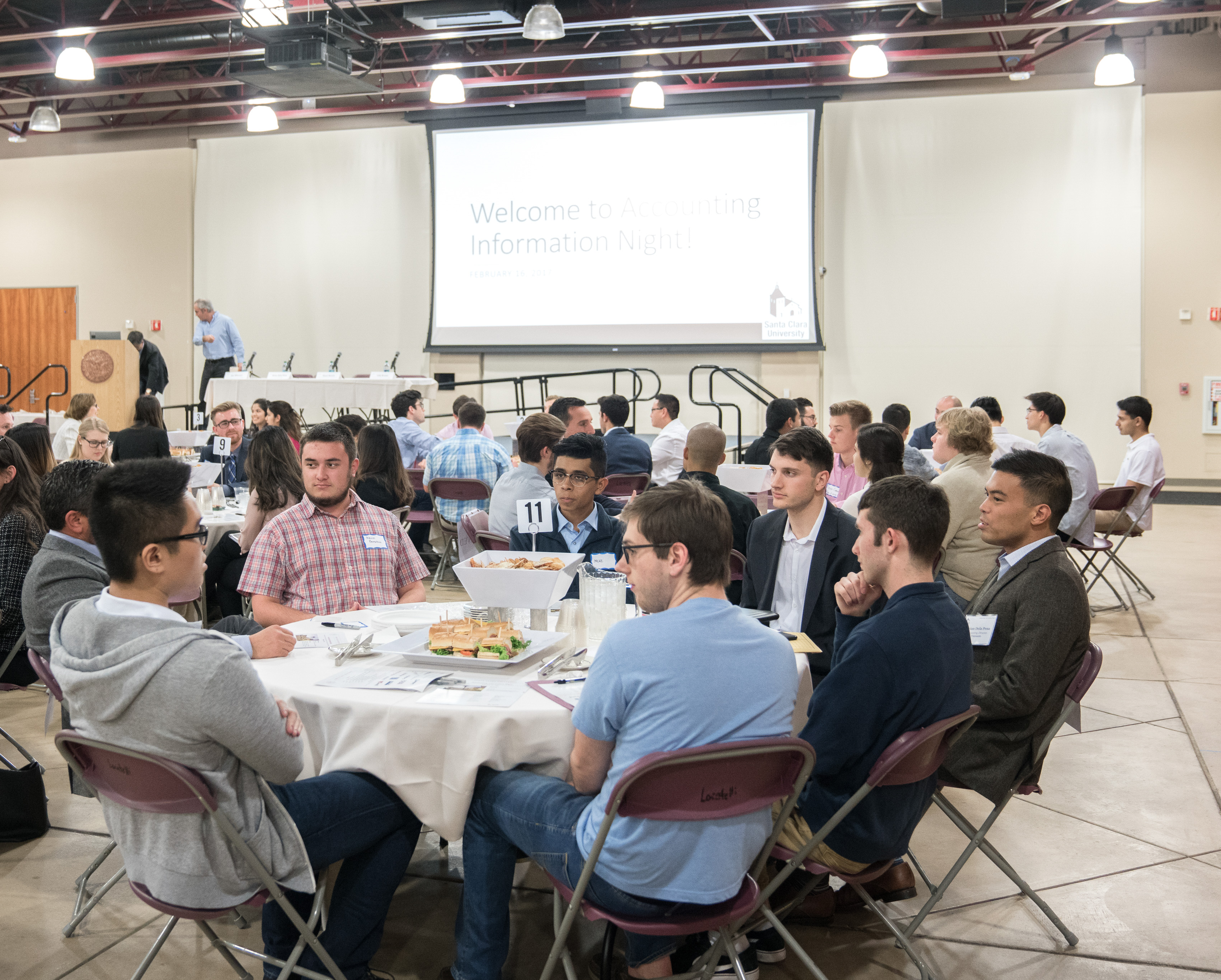 Each fall quarter, the SCU Accounting Association hosts Meet the Firms night where students are able to talk with representatives from accounting firms looking to hire students for either internships or full-time positions.