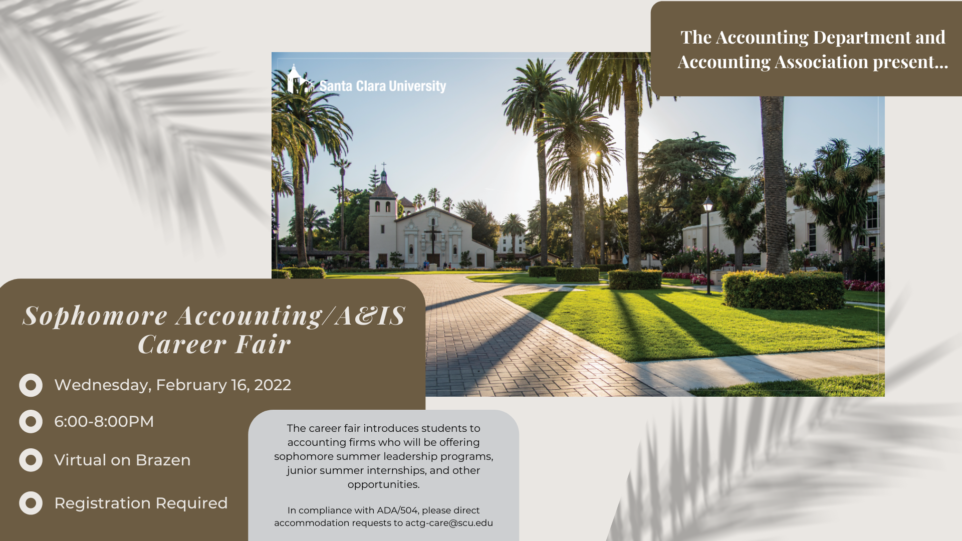 The Accounting Department and SCU Accounting Association (SCUAA) co-hosted the annual Winter Accounting/A&IS Career Fair on Wednesday, February 15, 2023 from 2:00-5:30 PM in Mission Gardens.