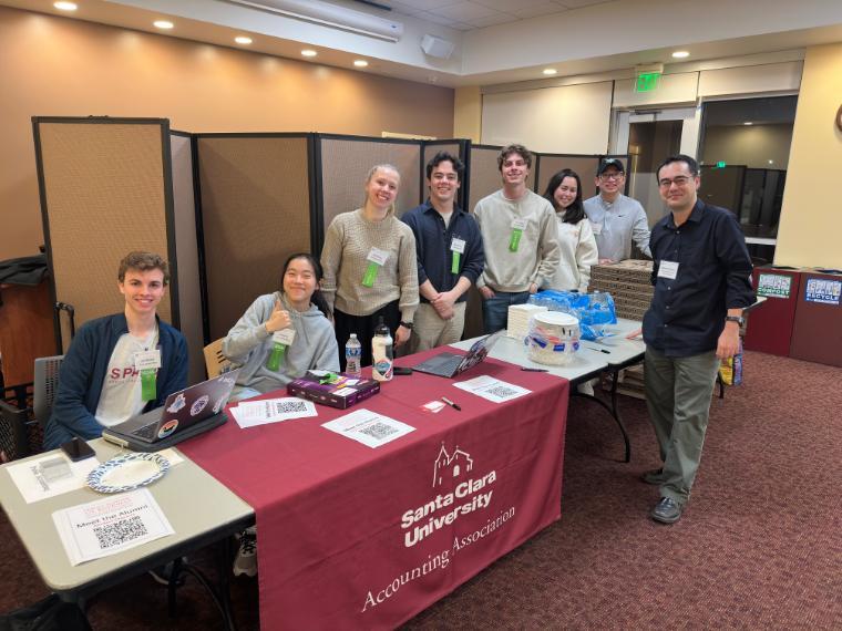 Professor Matt Cedergren and the SCU Accounting Association officers, from left to right: John Marrack (A&IS class of ‘25), Jessica Pu (Accounting class of ‘25), Maia Murphy (Accounting class of ‘25), Brendan Arias (A&IS class of ‘25), Mark Aquilio (Accounting class of ‘25), Megan House (A&IS class of ‘24), and Noah Chak (Accounting ‘24).