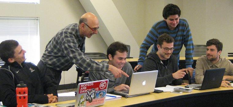 Above: Hersh Shefrin (at left, standing) works with Christian Workman and his team on the virtual company they run using open book management principles.