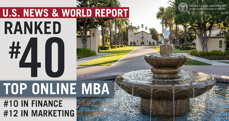 In an unprecedented jump of over 90 spots, Santa Clara University’s Online MBA has been ranked No. 40 by U.S. News and World Report. Of the 324 ranked programs, the online MBA out of the Leavey School of Business places within the top 15%, making it the No.1 program in the Bay Area and the No. 3 program in California. Drawing specific attention from the national ranking authority, the program’s finance concentration received a No. 10 ranking, while the marketing concentration came in at No. 12.
