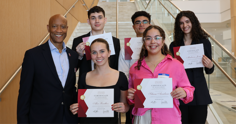 On Saturday, March 9, 46 Leavey students participated in the School’s first official International Business Case Competition, designed to help students gain valuable insights into market diversification, intricate trade dynamics, regulatory landscapes, and the profound impact of cultural nuances on every facet of business operations. Dean Ed Grier was on hand to announce this year's winning team, composed of Siham Arsalane '26, Joshua Diaz-Christians '26, Madison Jones '25, Nathaniel Roland '26, and Alex Xanthos '25.