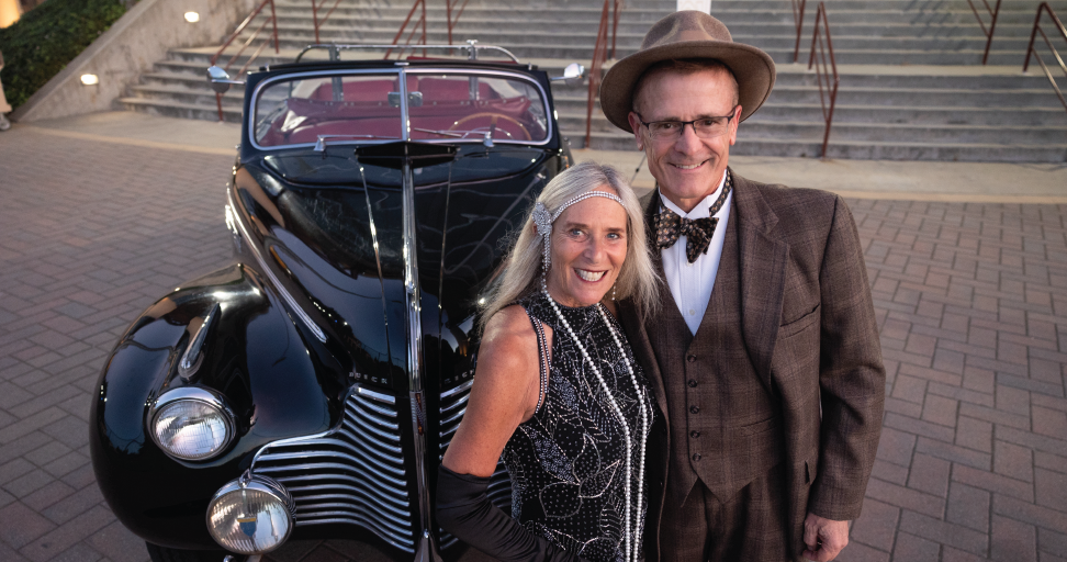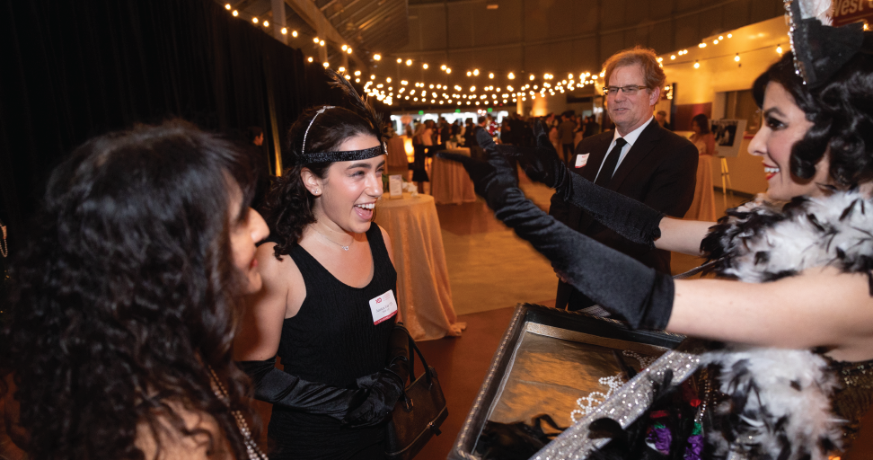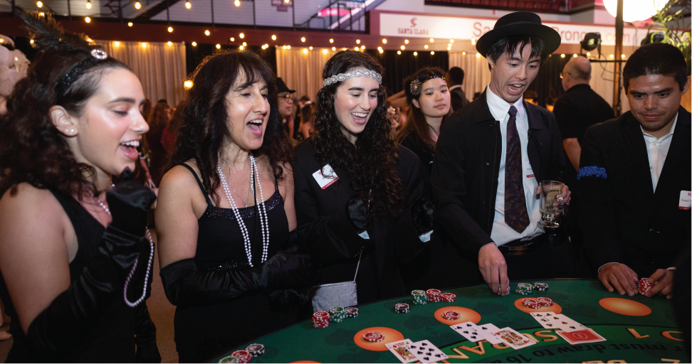Under a star-filled sky, more than 100 smartly attired guests wearing flapper dresses, headpieces, and zoot suits walked the red carpet into a swanky, roaring 20s-themed gala to celebrate 100 years of business education at the Leavey School of Business at Santa Clara University.
