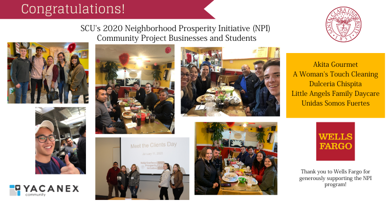 NPI is a course within SCU’s Leavey School of Business that provides about 20 undergraduate students the opportunity to collaborate with small business owners from local underserved communities. Students are put into groups and assigned a business owner who becomes their client for the two-quarter course. Students work with their business owners to develop an action plan during the winter quarter and then execute that plan in the spring quarter, with funds provided by a generous grant from Wells Fargo.