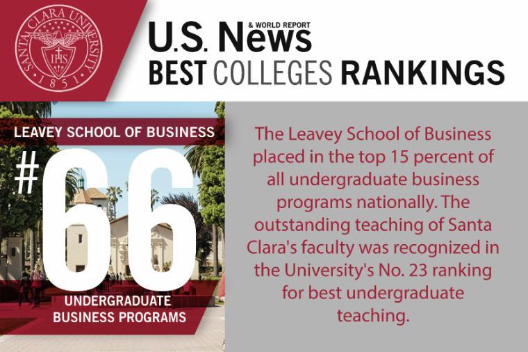 Santa Clara also was noted for its excellence in undergraduate business education (No. 66 out of over 500 universities nationwide); undergraduate teaching excellence (No. 23 among national universities); education for veterans; and campus diversity.