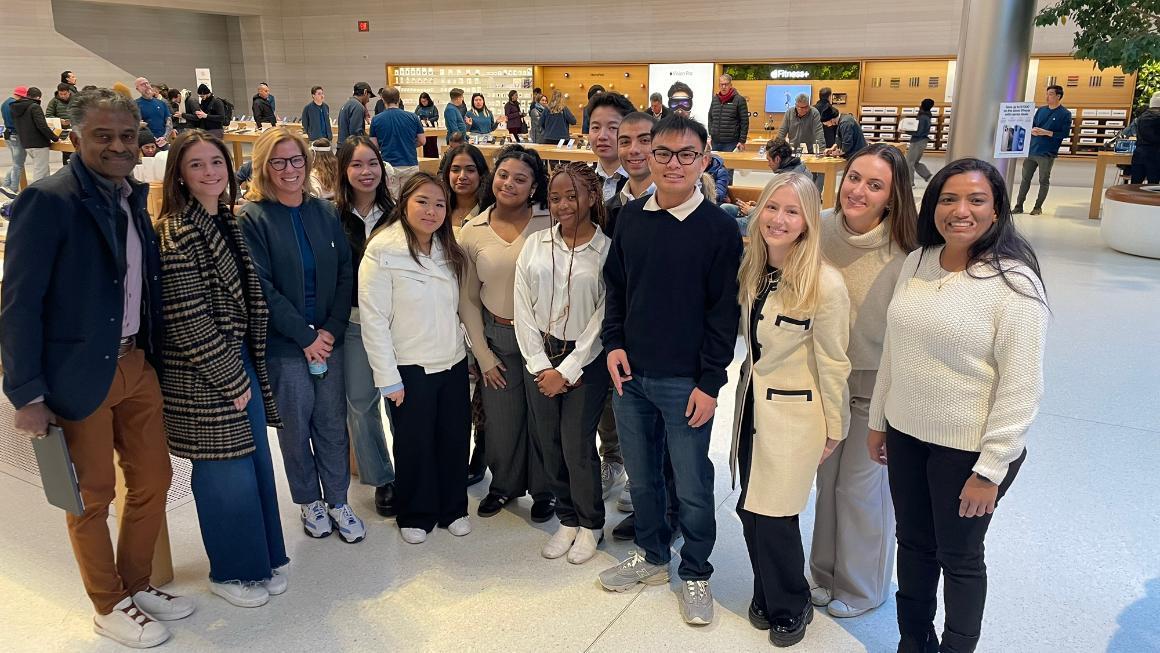 Students kicked off their day at the Apple Store on 5th Avenue, gaining valuable insights into store operations, recruitment strategies, and customer experience. Arranged with Apple’s leadership team, the visit offered an inside look at innovative retail design, leadership, and customer engagement. Students were particularly impressed by the store’s intentional design, from its architecture to strategic layout, creating an immersive and inclusive shopping experience. They found it eye-opening to see how Apple’s retail strategy fosters long-term customer connections. A highlight of the visit was the panel discussion and Q&A, where Apple employees shared their career journeys and perspectives on company culture, leadership, and professional growth. The smaller tour groups allowed for interactive discussions and hands-on learning, including exploring the latest Apple technology, iPhone features, and Vision Pro demos.