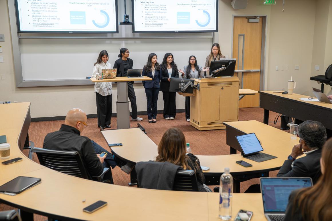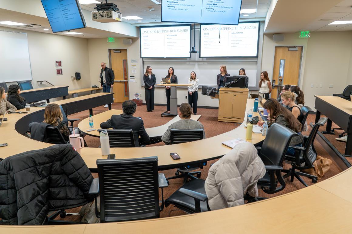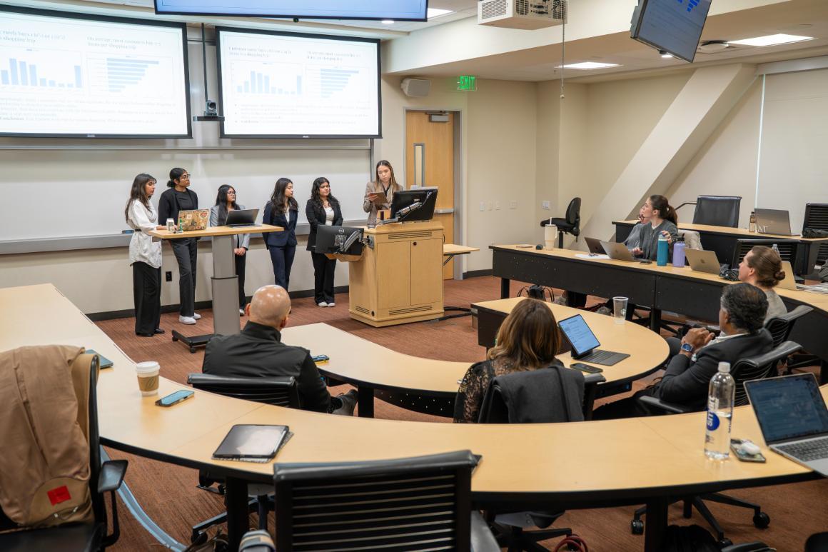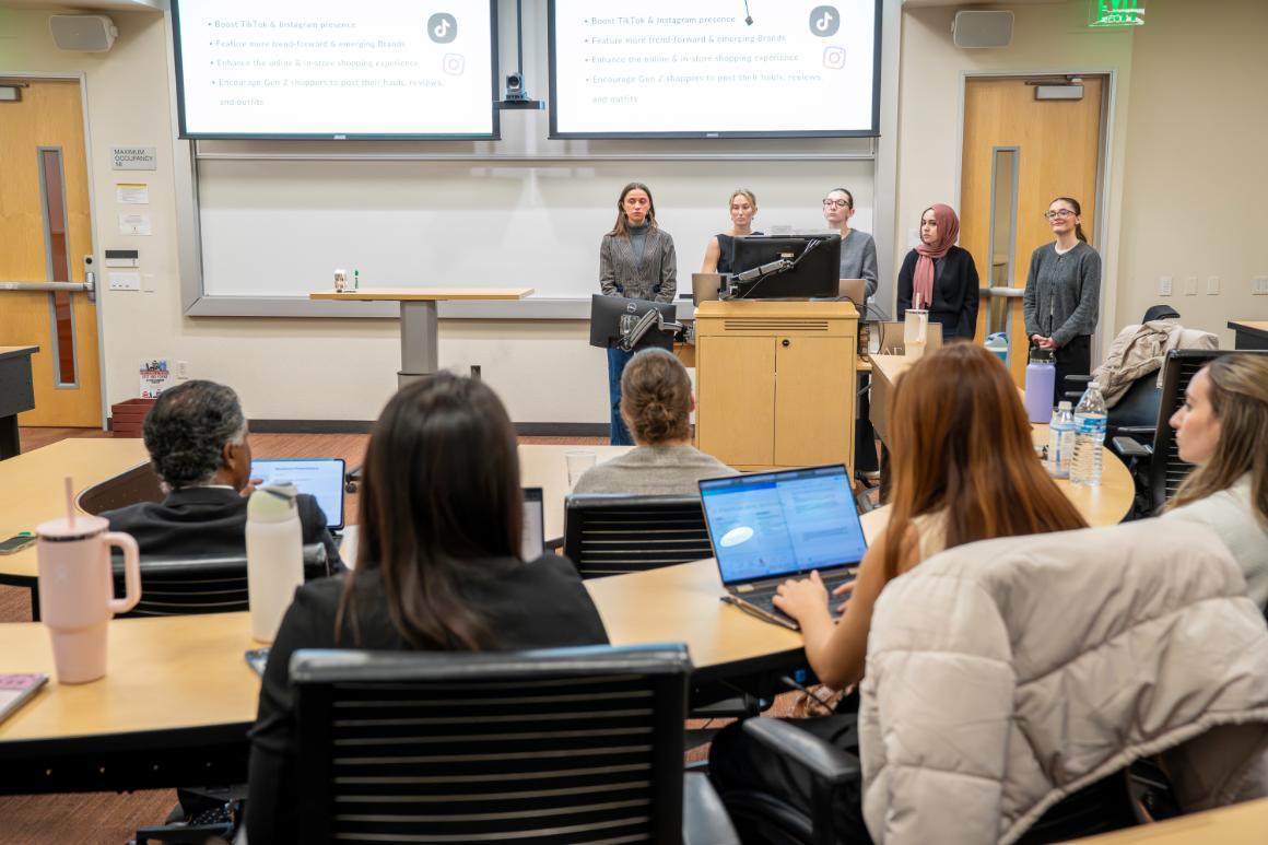 The following pictures show the SCU teams presenting to Amelia and receiving her reactions and feedback. What a wonderful opportunity for a senior in college to work with and gain insights from a seasoned retail executive. At the Retail Management Institute, we believe these types of experiences turbocharge our students' knowledge base, skill set, and confidence.