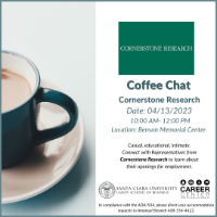 Thursday, 4/13, Coffee Chat with Cornerstone Research, 10:00 - 12:00 pm, Benson Center - Stop by for coffee and meet a recruiter from Cornerstone Research! No need to dress up or bring a resume. Simply bring your authentic self and be ready to engage in authentic conversations with a recruiter!
