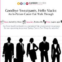 Monday, 4/10, Goodbye Sweatpants, Hello Slacks: An In-Person Career Fair Walk Through, 12:00 - 2:00 pm, Benson Center - Parlors B&C/In-Person - Get out of your sweatpants, get your head out of the clouds, and immerse yourself in the crowds: prepare for SCU’s upcoming in-person Spring Career Fair. Register on Handshake. Drop by Parlors B&C anytime between 12-2 pm for the Career Center’s first-ever in-person career fair walk-through. In a simulated fair environment, go from booth to booth to: