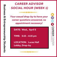 Wednesday, 4/05, Career Advisor Social Hour, Drop by Career Answers/Coaching, 3:15 - 4:15, Lucas Hall Lobby - Noel Kreidler, the Assistant Director for Career Development - Business & Entrepreneurship is hosting weekly drop-by Career Advisor Social Hours in the Lucas Hall Lobby most weeks of the Spring Quarter. These drop-by times are an opportunity to get your career questions answered in a casual environment, and no appointment is necessary.