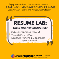 Thursday, 4/06, Resume Lab: Telling Your Professional Story, 12:15 - 1:15 pm (optional until 1:45 pm), Benson Center - Parlors B&C/In-Person - REGISTRATION IS REQUIRED - Join us for Resume Lab: Telling Your Professional Story! Whether you are preparing for the upcoming in-person Spring Career Fair, looking for support in completing a resume assignment for class, or just hoping to get started with your resume before the end of the school year, the career center has your back!