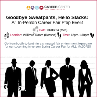 Monday, 4/8, Goodbye Sweatpants, Hello Slacks - Register on Handshake, 12:00 - 1:30 PM, Williman Room