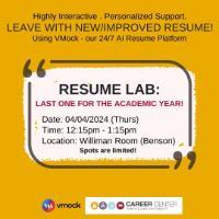 Thursday, 4/4, Resume Lab - Register on Handshake, 12:15 - 1:15 PM, Williman Room