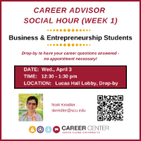 Wednesday, 4/3, Career Advisor Social Hour, Drop by Career Answers/Coaching, 12:30 - 1:30, Lucas Hall Lobby