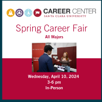 All Santa Clara University students and alumni are invited to attend our 2024 Spring Career Fair. During the fair, you can: