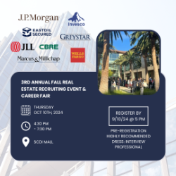 Real Estate Recruiting Event & Career Fair - Join us for the 3rd Annual Real Estate Recruiting Event & Career Fair on Thursday, October 10th from 4:30 to 7:30 pm in the SCDI Mall. The Career Fair is a great opportunity to meet the top real estate employers and firms in a professional setting. Pre-registration for this event has passed, but drop-ins are welcome to join!