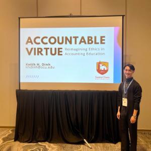 Keith Dinh ’25 (Accounting) presented his paper, "Accountable Virtue: Reimagining Ethics in Accounting Education," at the 34th Annual Association for Practical and Professional Ethics (APPE) International Conference in Norfolk, Virginia, in February. His paper examines the limitations of rule-based ethical frameworks in accounting education and advocates for integrating virtue ethics—particularly the cardinal virtue of Prudence—to cultivate ethical resilience and moral leadership among future accountants.