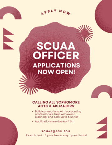 The SCU Accounting Association is now accepting applications for officer positions! This is an excellent opportunity for sophomore ACTG & AIS majors to gain leadership experience, build connections with accounting professionals, and contribute to event planning. Officers may also have the opportunity to earn up to six units.