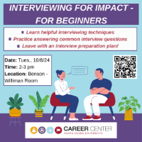 Tuesday, 10/8, Interviewing for Impact, 2 - 3pm, Williman Room - Benson Memorial Center