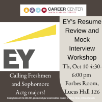 Thursday 10/10, EY Resume/Mock Interview Workshop, 4:30 - 6pm, Forbes Room - Lucas 126: Sign up for EY's Resume Review and Mock Interview Workshop to enhance your resume, refine your interview techniques, and gain valuable feedback from experienced EY professionals! This workshop is designed for 1st and 2nd years.