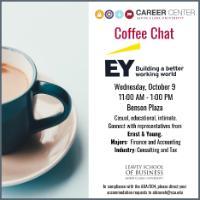 Wednesday, 10/9, Coffee Chat with EY, 11am - 1pm, Benson Plaza: Our friends at EY will be on campus to share more about open job and internship opportunities. All students are welcome to drop by though they'll be here to recruit students with Business majors. Don't miss this great opportunity to get connected to reps from EY… over coffee and pastries!