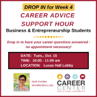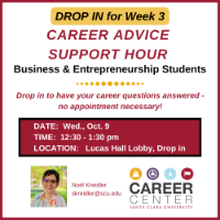 Wednesday, 10/9, Career Advice Support Social Hour #3, Drop in Career Answers/Coaching, 12:30 - 1:30pm, Lucas Hall Lobby