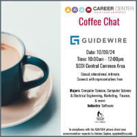 Wednesday, 10/9, Coffee Chat with Guidewire Software, 10am - 12pm, SCDI Lobby: Representatives from Guidewire software will be on campus actively hiring SCU students! This is a great opportunity to learn more about the company, their open jobs/internships, company culture, hiring and interview processes, etc…. over coffee and pastries! No need to print your resumes or dress up-- this is casual. Come enjoy a cup of coffee and meet our friends at Guidewire software! They are targeting STEM students AND Business students for open roles. Take a look at their open positions here: https://careers.guidewire.com/
