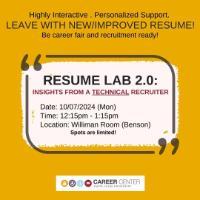 For our second of two resume labs offered this quarter, a Senior Technical Recruiter, Early in Career from ServiceNow will be joining us and sharing their insights into effective resume writing alongside Assistant Director of Career Development, Vania Tong.