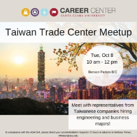 Tuesday, 10/8, Taiwan Trade Center Meetup, 10:00 am - 12:00 pm, Benson Parlors B/C: The Taiwan Trade Center San Francisco will showcase 10 leading Taiwanese companies, including Inventec North America, Andes Technologies, TSMC, nVidia, Micron, ASUS, Quanta Computer, Etron Technologies, Mega International Bank, and Taishin Bank. Contact TAIWAN is an online job-matching platform for Taiwanese companies and international professionals. In addition to providing online job-matching services and personalized consulting, the Contact TAIWAN website also offers information on Taiwan's talent acquisition policies. Engineering and business majors are welcome!