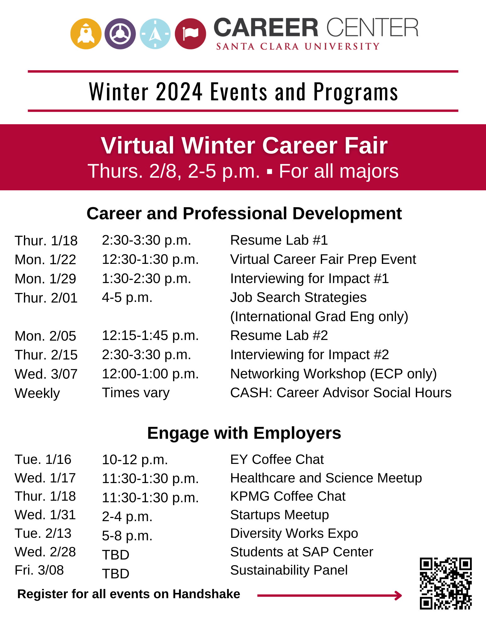 The Career Center is pleased to offer a robust schedule of career development and employer engagement events this winter quarter. Please see our calendar for the most up-to-date information.