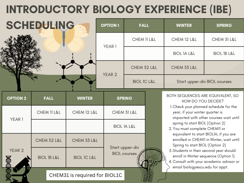 The introductory biology sequence is a three-quarter-long sequence starting with BIOL 1A. BIOL 1A and 1B have half-labs (i.e., students meet every other week), while BIOL 1C has a full (weekly) lab. This sequence will be taught twice per academic year, once starting in the winter and then again starting in the fall. Therefore, students will finish the sequence in their sophomore year (either in the fall or winter).