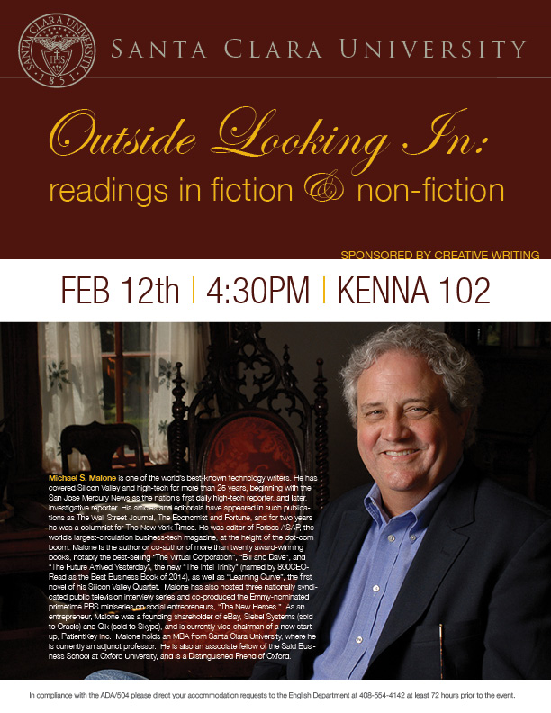 This year the English Department and Creative Writing Program sponsored poetry readings by SCU alumni Peter Verbica and Janice Dabney and SCU faculty members Tim Myers and Philip Kobylarz, a fiction and nonfiction reading by SCU alumnus and faculty member Mike Malone, and a storytelling event with SCU faculty members Tim Myers and Andy Garavel.