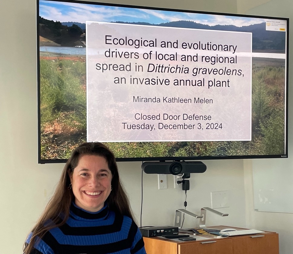 For her doctoral dissertation at UC Santa Cruz, under the guidance of Dr. Ingrid Parker, Miranda investigated the ecological and evolutionary drivers of the spread of Dittrichia graveolens (stinkwort), a recent plant invader in California. Most often found in disturbed areas such as roadsides, this species has recently begun invading more intact plant communities. Miranda designed a combination of lab, greenhouse, and field experiments to uncover the factors behind Dittrichia’s rapid expansion in California. Her Ph.D. committee included ESS professor Dr. Virginia Matzek, who was delighted to see a student she’d first known as a first-year undergraduate reach the pinnacle of academic achievement!