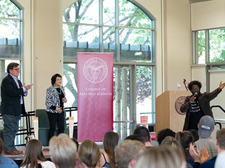 W. Kamau Bell completed his visits to campus on May 24, 2018, and left a legacy of reflection, learning, understanding of how to build empathy and reconciliation through dialogue and yes, humor.  The Emmy-winning stand-up comedian, author, and CNN host offered incisive and scathingly funny commentary on modern society that helped change views on race, politics, identity and social issues in the United States. Joined by his spouse, Dr. Melissa Bell, SCU '01, Sinatra Faculty Fellow Danielle Morgan, Sinatra Student Fellow Julia Joyce and comics, academics, and thought-provoking guests, Mr. Bell visited classes, offer workshops for students, faculty, and staff, and entertained and informed the campus and Silicon Valley community.
