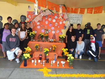 Students from Lucia Varona’s Intermediate Spanish with Experiential Learning collaborated with the mothers from Washington Elementary School in putting up the Day of the Dead altar. Students share with the mothers of that school 16 hours a quarter practicing Spanish and learning about different Latin American cultures.