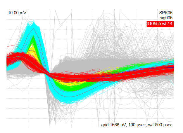 Screen shot of an actual neural recording of neurons firing action potentials. Image shows electrical signals from 4 different neurons (4 colors) that were captured on one recording electrode. Each neuron has a unique waveform (shape of its action potential, or "firing") that enables the differentiation of neural signals coming from individual cells.