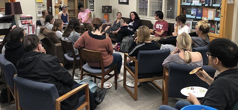 On October 17, eighteen students and six faculty gathered for the first Religious Studies Conversations event of the year, led by Professors Pearl Barros and Michelle Mueller and moderated by Paul Schutz. Over pizza and snacks, participants discussed the intersections of religion, gender, and sexuality.