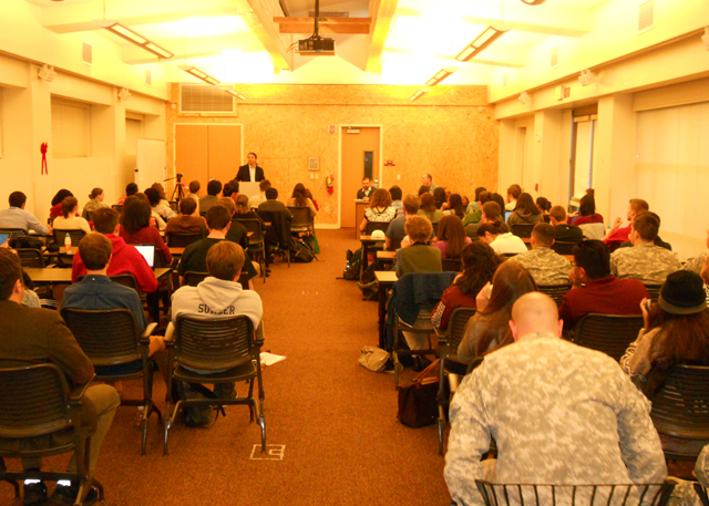 Professor Elijah Reynolds (Modern Languages), in his talk on "Brand Recognition and the Da'esh Crime Syndicate," gave attention to the issue of nomenclature. Rather than "legitimize" ISIS by referring to this terrorist group as "Islamic" in any way, argued Professor Reynolds, it's better to call it by its Arabic acronym "Daesh," a word that for Arabic-language speakers echoes a word that also means "trample, crush, tread underfoot"---a term that evokes the hugely destructive force of this organization. He also argued that rather than understand this group in terms of religion, it's more appropriate to think of it as a "crime syndicate," like drug cartels in other parts of the world--that is, as an organization primarily concerned with making money.