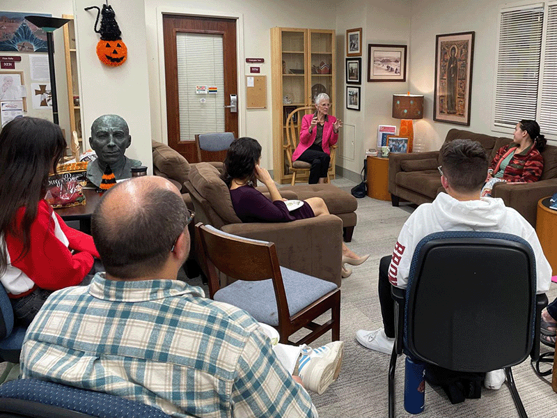 On Wednesday evening, October 25, the Religious Studies Department held its first RS Conversation of the year, hosting social activist and Commonweal columnist Jo McGowan for pizza and casual conversation. McGowan is the founder and director of Latika, an NGO in northern India that provides education and specialized services for people with disabilities. Perhaps her less well-known (but nevertheless esteemed) claim to fame, however, is that she is the mother of the department’s own Prof. Cathleen Chopra-McGowan! Jo McGowan spoke about her long history as an activist, both in India and in the U.S., reflecting on her motivations, hopes, and struggles and encouraging the students who were present to engage in their own activist pursuits. The crowd was intimate and intergenerational–part of the intent of RS Conversations events–and the conversation was lively!