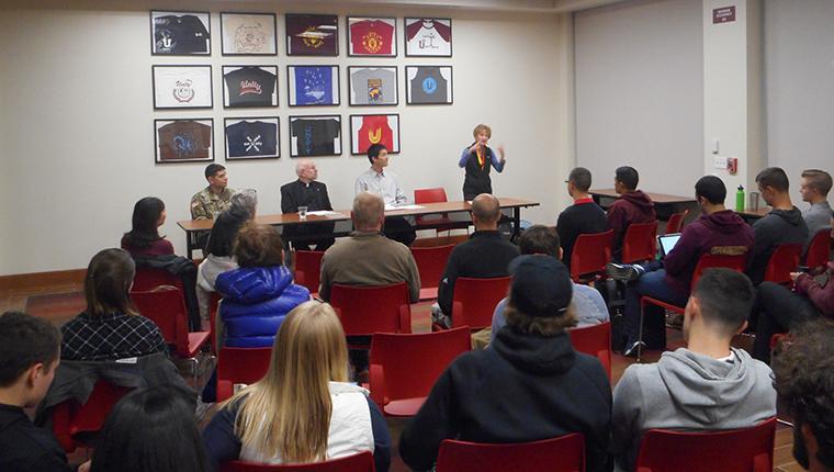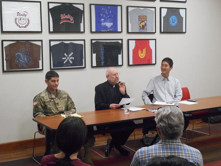 The final program, “Living with Conviction: ROTC at SCU – Collaboration or Contradiction?” drew nearly 50 people to listen to a panel of differing viewpoints discuss the role of ROTC on the SCU campus in light of Catholic teachings on pacifism and Just War. Rev. Thomas Massaro, S.J. (Jesuit School of Theology, SCU) kicked off the panel with an overview of the development of just war theory as well as pacifism in the Catholic tradition. Dan Fisher of SCU’s Military Science Department spoke about how he came to join the army, his experiences in combat, and the importance of the education SCU offers to young men and women training to be officers and leaders in the military. Fumi Tosu from Casa de Clara spoke about how his family’s experiences during World War 2, including the bombing of Hiroshima, have shaped his views on pacifism and his convictions that Catholic universities should not be engaged in preparation for violent conflict. Professor Gibson moderated the panel, setting a respectful tone that animated a thoughtful interaction among the panelists and the audience.