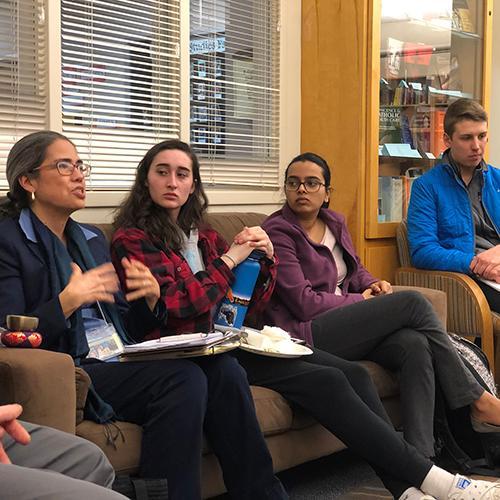 On February 11, eighteen undergraduate students and six faculty gathered for the second Religous Studies Conversations event of the 2018-2019 academic year, "A New View of Suffering: Buddhism, Mindfulness, and Transformation." Led by Profs. David Gray and Sarita Tamayo-Moraga and moderated by Prof. Paul Schutz, the conversation explored theoretical foundations of Buddhist thought and led participants through several mini-meditation practices. After introducing varieties of Buddhism, Prof. Gray discussed the meaning and the application of the Four Noble Truths and the Eightfold Path, which stand at the center of the Buddhist teachings on suffering and mindfulness. Then, Prof. Tamayo-Moraga invited participants into a series of meditative exercises aimed at illustrating how meditation and mindfulness practices embody the theory described by Prof. Gray. After these presentations, participants asked numerous questions about Buddhism and its practice.