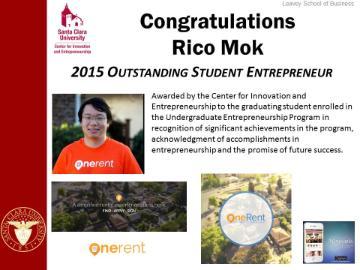 Active in CIE Enrichment Opportunities like our quarterly Office Hours for Entrepreneurs, Rico and his team has met with multiple alumni CIE Office Hours providers to discuss OneRent. The CIE also was pleased to feature the OneRent team at well-received presentations to the CIE Advisory Board and as a part of the CIE presentations at SCU's Family Weekend, showcasing student startups. TheOneRent team also participated in CIE's Startup Expo career and internship fair open to area startups, already giving back to the University by providing internship and career opportunities for fellow students.