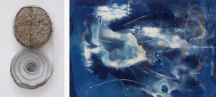 Images, left to right: Mari Andrews, Stoneswirl, 2014, stone and found metal, Courtesy of Chandra Cerrito Contemporary, Oakland. Ann Holsberry, Navigating by Stars 2, 2014, Cyanotype, gouache, and encaustic on paper mounted on panel, Courtesy of the artist.