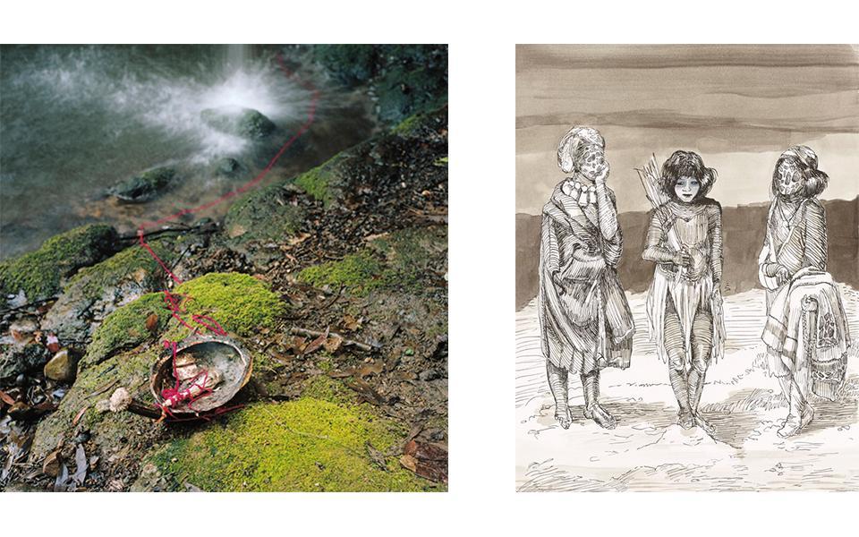 Images: Left - Mercedes Dorame, Smoke to Water - Chyaar Paar ‘Apuuchen from the series Earth the Same as Heaven - ‘Ooxor ‘Eyaa Tokuupar, 2013, archival pigment print. Museum Purchase, Acquisitions for Diversity Project, work selected by students in SCU Professor Mario Caro’s winter 2018 class, ARTH 147: Native Women in Contemporary Arts. Funds for this purchase were made possible by the Hearst Foundation’s Community Initiatives for the Visual Arts grant (CIVA). de Saisset Museum permanent collection, Santa Clara University, 2018.4.3. Right - Katie Dorame, Converts on the Path, 2014, pen and ink on paper. Museum Purchase, Acquisitions for Diversity Project, work selected by students in SCU Professor Mario Caro’s winter 2018 class, ARTH 147: Native Women in Contemporary Arts. Funds for this purchase were made possible by the Hearst Foundation’s Community Initiatives for the Visual Arts grant (CIVA). de Saisset Museum permanent collection, Santa Clara University, 2018.3.2