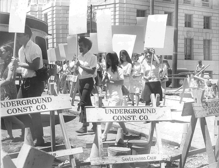 Image: Lawrence Halprin, Blank Placard Dance, San Francisco, 1967, black and white photograph documenting performance by Anna Halprin and the San Francisco Dancers Workshop. Image Courtesy of Anna Halprin.