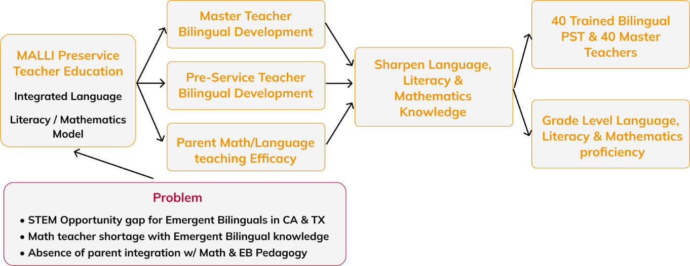 Project MALLI offers an innovative approach to preparing bilingual pre-service (B-PSTs) and Bilingual Cooperating Teachers (B-CTs) to build language and literacy across languages of instruction with Kindergarten-5th grade Emergent Bilingual Learners (EBLs) in mathematics. Math offers an authentic context to acquire the academic register that often eludes EBLs.). To further optimize language and math learning for EBLs in and out of the classroom, parents are also provided with professional learning opportunities in developing math knowledge and language development at home.